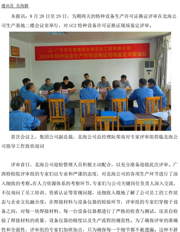 北海公司通過特種設(shè)備生產(chǎn)許可證(壓力管道)換證現(xiàn)場評審