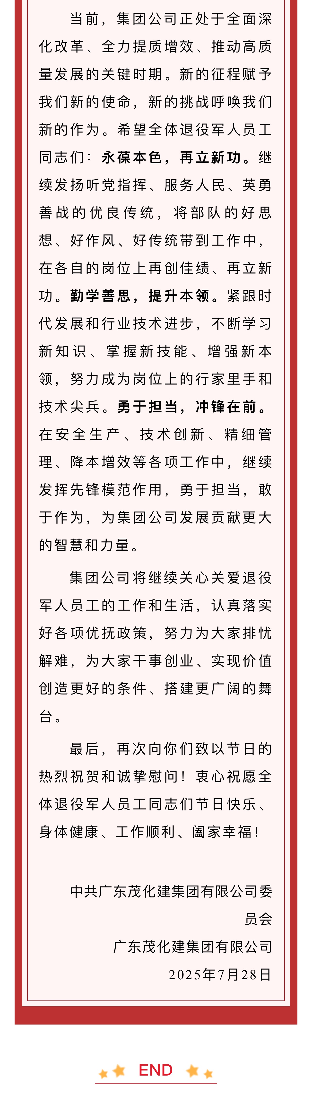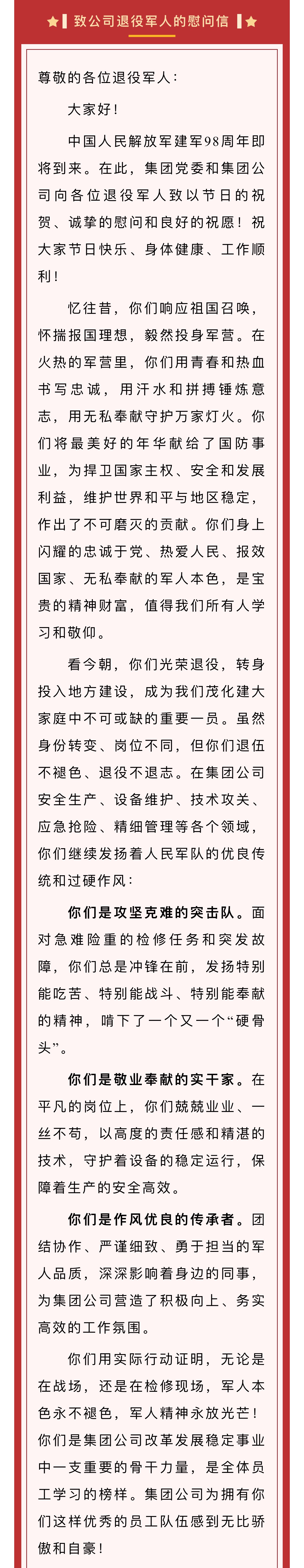 八一建軍節(jié) | 致公司退役軍人的慰問信
