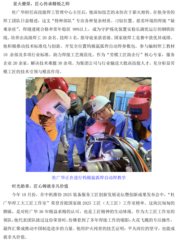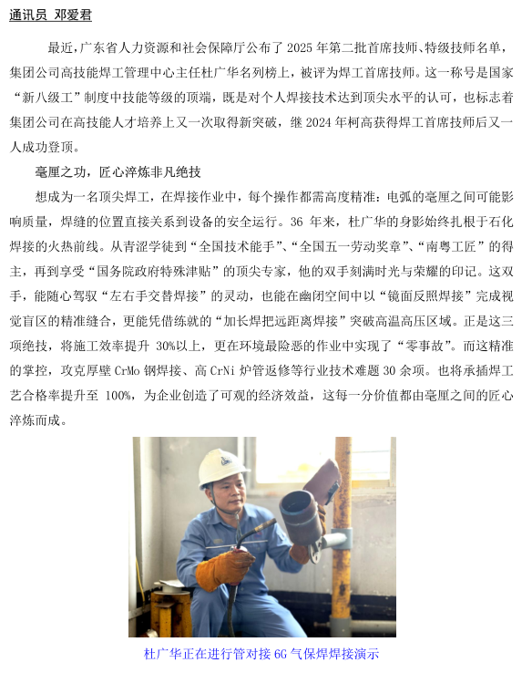 杜廣華被評為焊工首席技師 晉升國家“新八級工”制度中技能等級頂端